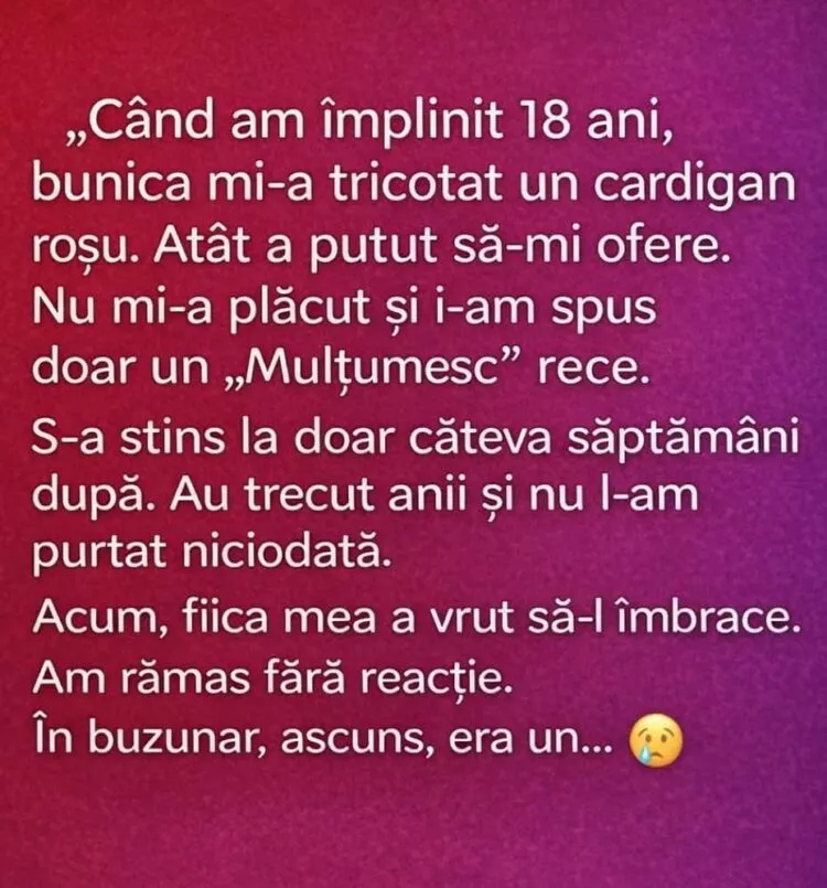 Când am împlinit 18 ani, bunica mi-a oferit un cardigan roșu, tricotat de mâinile ei. Atât a putut. Atât a avut.