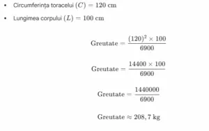 Greutatea aproximativă a porcului (în kilograme) se determină aplicând următoarea formulă, unde măsurătorile (C și L) sunt în centimetri (cm):