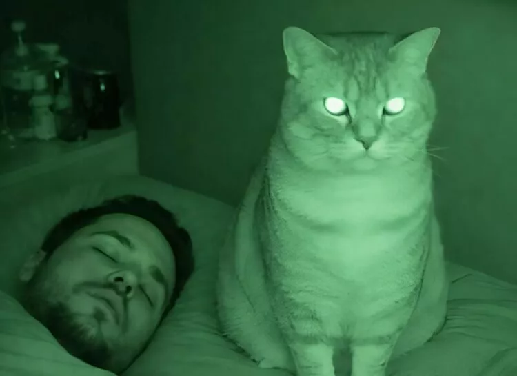 Se pare că misterioasa ei „veghe nocturnă” nu avea nimic supranatural. Pisica noastră pur și simplu nu mai suporta sforăitul și își inventase propria metodă de a restabili liniștea.