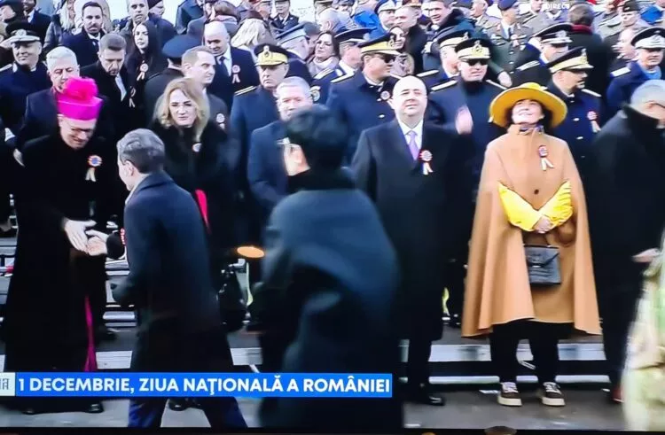 În tribuna oficială, printre numeroase personalități ale statului, o prezență feminină s-a remarcat imediat: o doamnă elegantă, purtând o pălărie galbenă, accesoriu care a atras atenția încă de la sosirea sa.